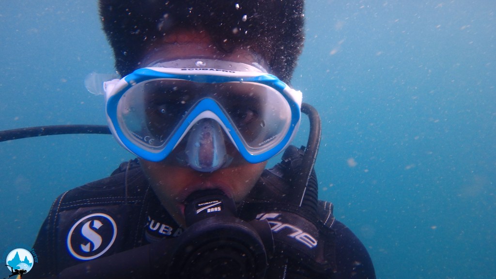 Just as I thought I can try and go deeper below, my throat started painfully pricking and paining with each breath I took from my mouth. The dry throat, earlier due to a panic attack, now came back to haunt me threatening to cut my dive short. No matter how much I tried it just got more and more painful with each breath. By this time my kiddo had dived down to about 10 meters or so and was signalling something to his instructor. Soon enough they started coming upwards. Apparently his ears started paining as he wasn’t able to equalize below 10 meters and had to come up (On your first dive you can go upto 12 meters). I stayed underwater for another few minutes and once my son reached the surface we both climbed back into the boats after a one last glimpse to the underwater world below.