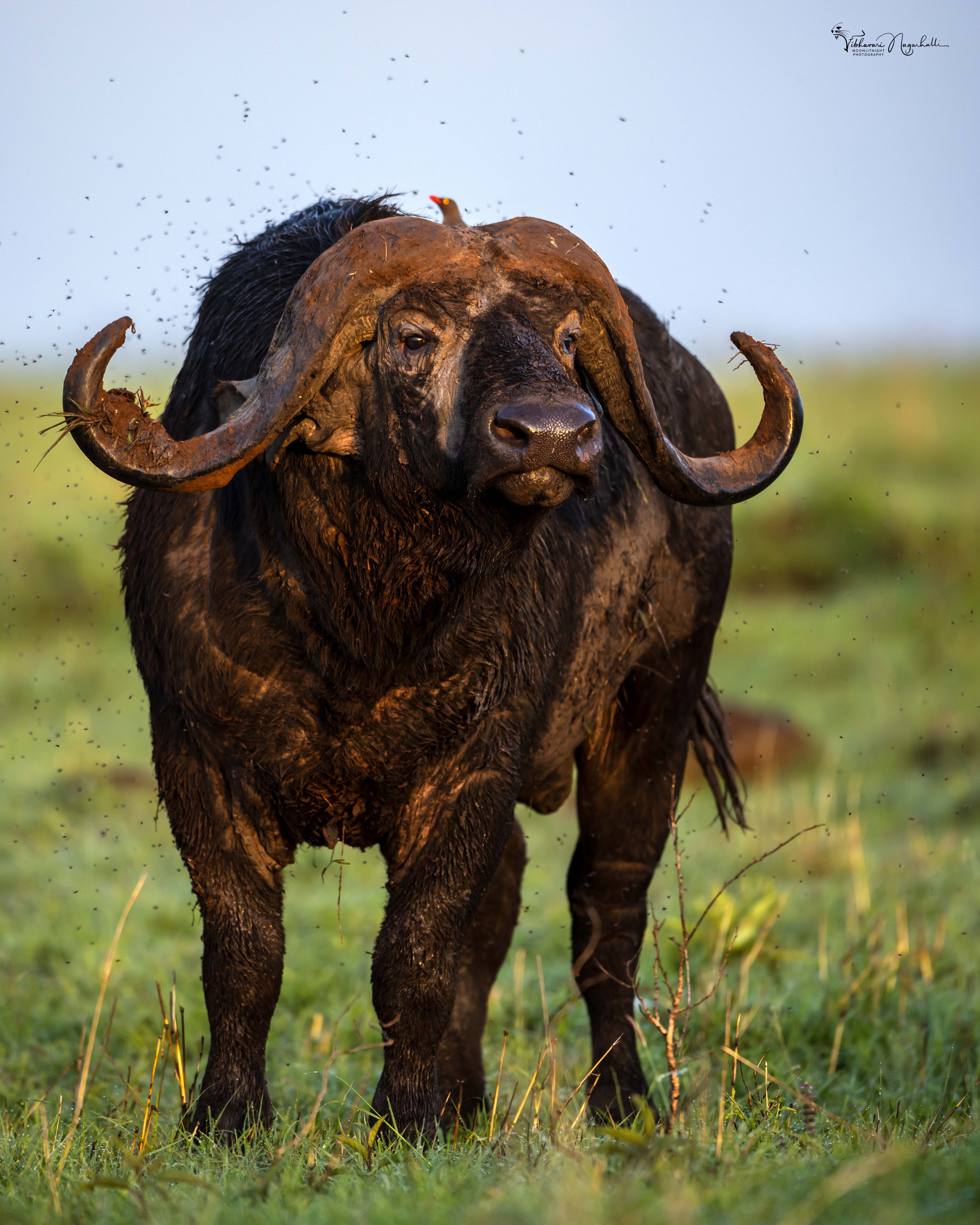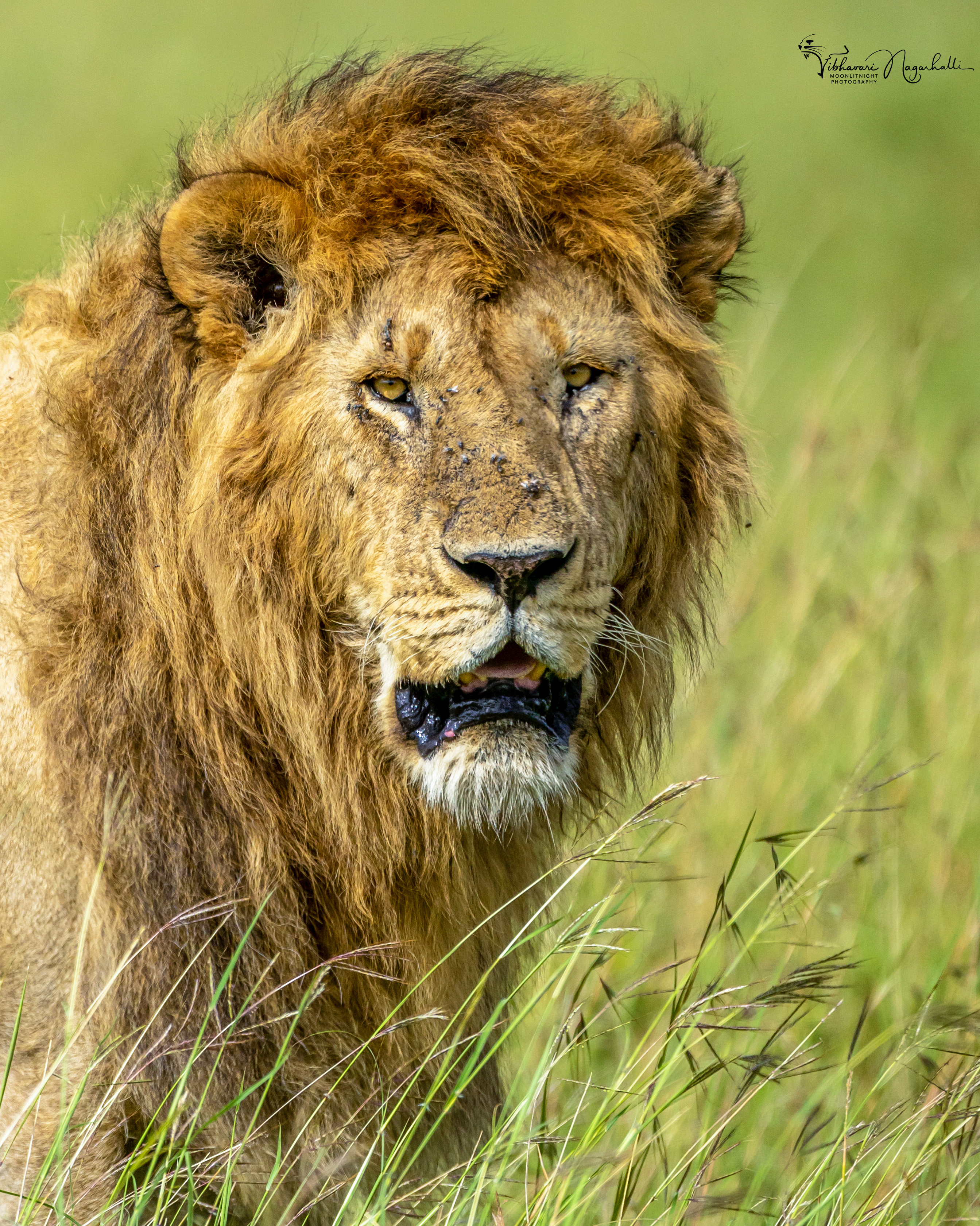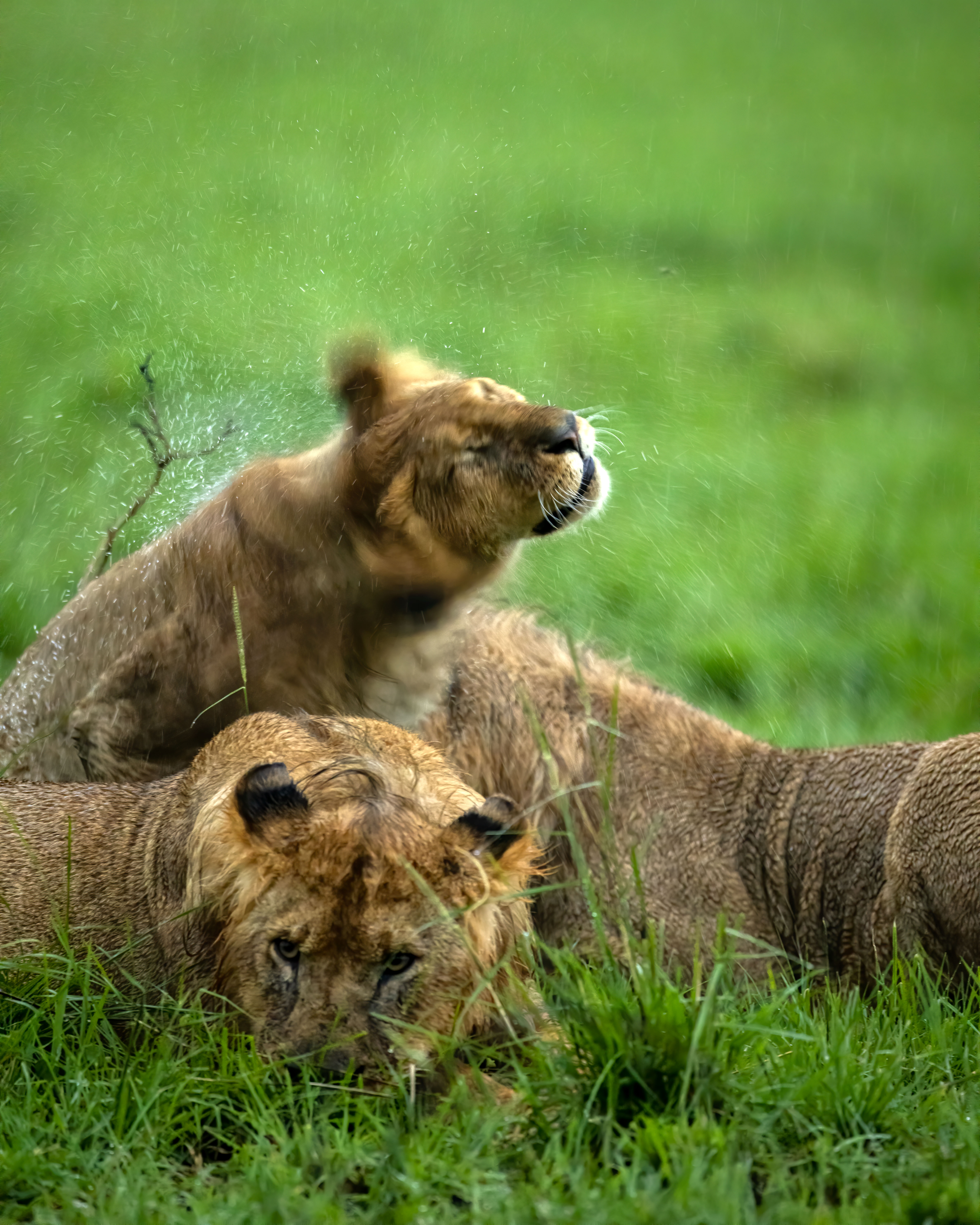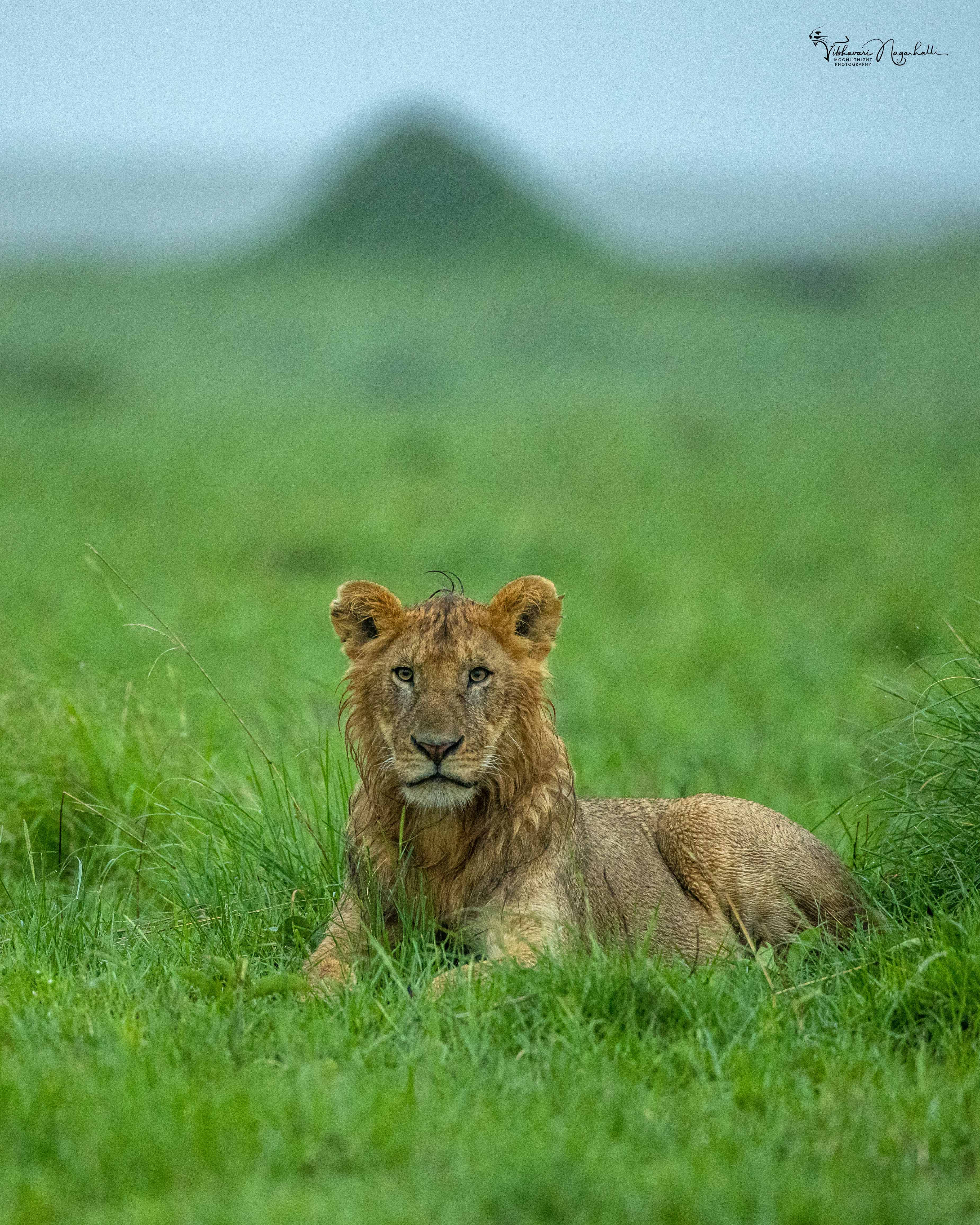Next was the dream destination of Masai Mara. The moment I entered the park I was Gobsmacked by the landscape. Large swathes of the famed Savannahs were a sight for sore eyes. Never-ending grasslands go on and on till your eyes can see beyond the horizon. Tall green-brown grass covers every inch of the land. The landscape is sparse, strewn with umbrella acacia trees in most cases the landscape had a lone acacia tree which breaks the monotony of the grasslands. The grass was so tall it covered almost half the body of the elephant. Do you remember that wallpaper of Windows on Desktops/Laptops with green/brown grasslands and a blue sky with fluffy clouds? The Mara grasslands are exactly that and much more beautiful than that image. In some places, you see a patch of forests with rocks and boulders which works as a perfect perch for the pride of lions. I visited Masai Mara in monsoons, hence the grass was green in most places which acted as a perfect backdrop for my images. The lions are so damn gorgeous lying there on the green grass, with a drizzle falling on them. That wet mane and piercing gaze makes for an image that imprints in your mind forever. And just then when it shakes off the water and those droplets fly…your heart is sure to skip a beat.