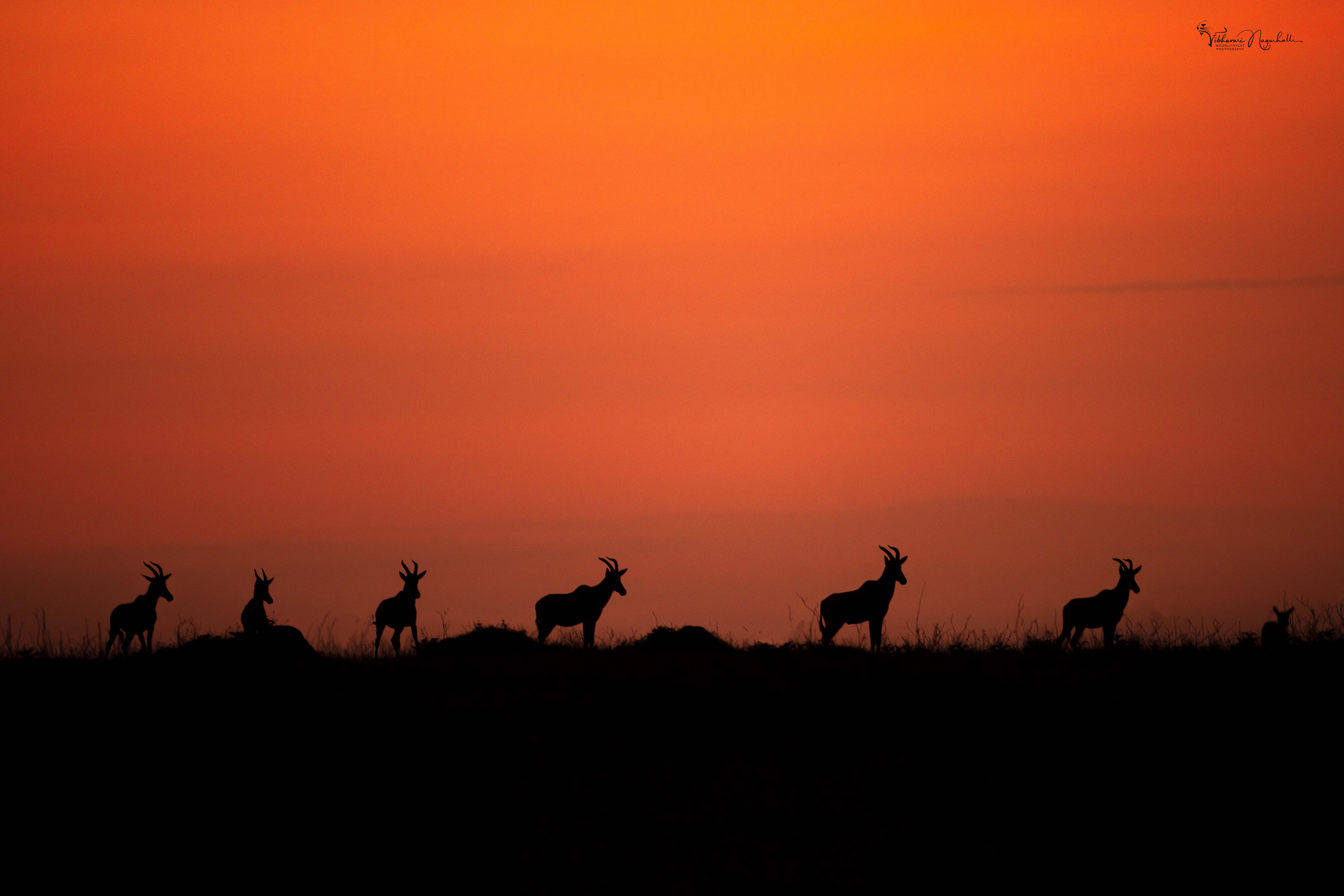 One such evening we were following a pair of Cheetahs. They were lazing when we first saw them, then they got up to climb a mound to survey the landscape for preys. Suddenly the sky started to turn grey with thick clouds. Storm was brewing up and it became more dark. A sliver of sunrays piercing through those dark clous lit up this cheetah pair making their eye glow a fiery orange. They looked absolutely stunning against the backdrop of dark clouds. There was thunder and lightening , cool breeze blowing through and then the rain showers descended in a crescendo drenching the entire landscape. That was one of my most unforgettable evenings. Almost 4 out of our 5 evenings in Mara were stormy. One evening though we were able to capture a beautiful sunset silhouette.