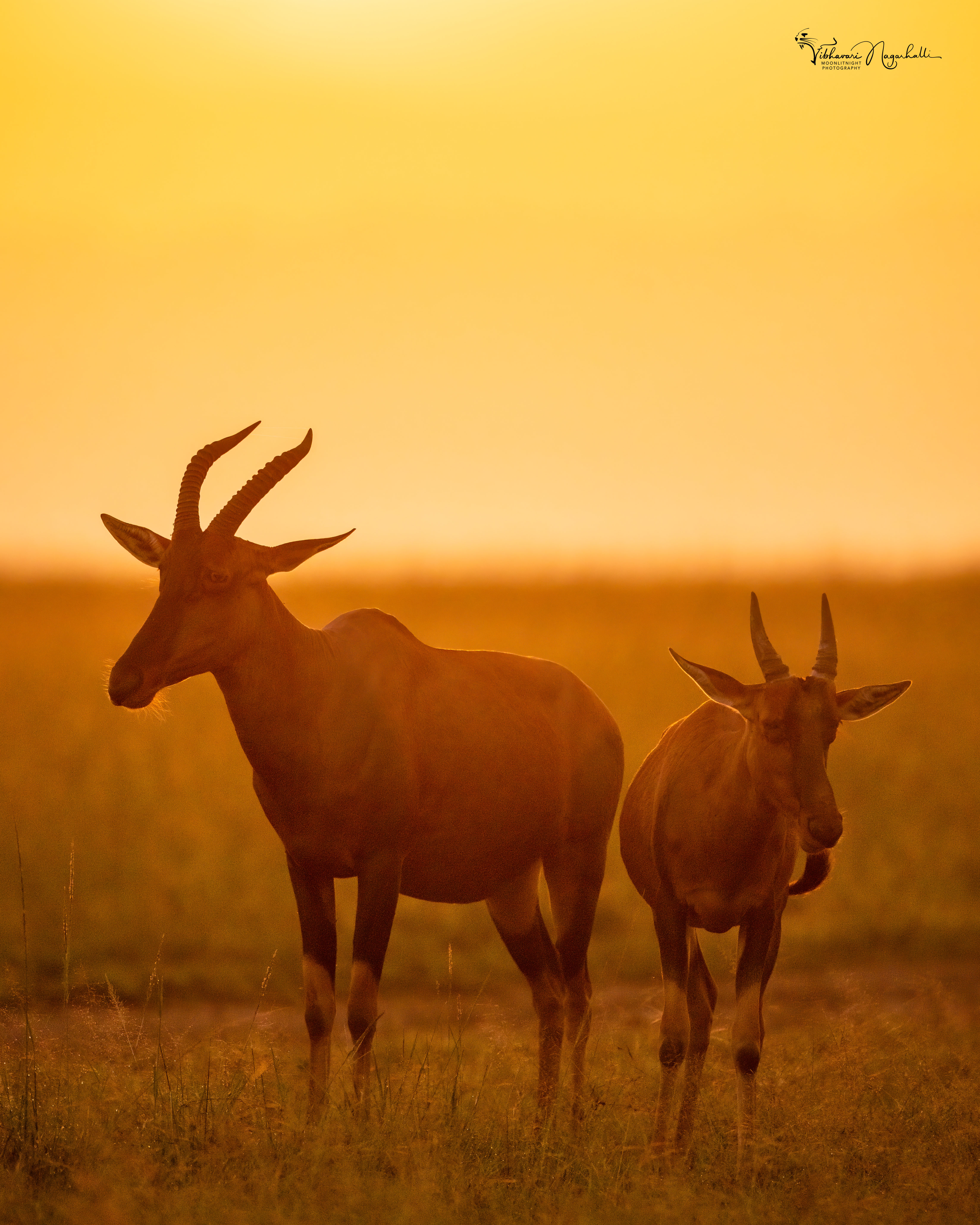Then they were these unique animals that add variety to this beautiful ecosystem. We saw Jackson’s widow bird which jumps up and down the grass with its fancy tail flopping about to attract its mate. You wonder about what animals must do to attract a mate :-). Small passerine birds like the Lark, glide and hover through the air above the grass at our eye level. They have the most melodious bird song I’ve ever heard. The Hyrax’s were scampering about our property. I didn’t know that these rodent-sized animals are closest relatives of Elephants no less!! I was itching to see a Hippo with its mouth open and my wish was granted! On our walk on the banks of the Mara river, Two hippos were fighting it out in the river with their mouths wide open trying to attack each other. I also got a chance to get up close with a crocodile basking on the banks of the river, it had the most gorgeous green eyes. The Topis and Hartebeests with their pointy horns make for excellent subjects to photograph. Did you know that the Vervet monkeys have bright blue testicles? I also saw large birds like the secretary bird, a terrestrial bird with tall Ostriches sprinting about. A spitting cobra slithered across the road and went inside a burrow. This gorgeous colorful Rock agama was doing its push-up routines to scare us away. Had a fleeting glance of a Caracal as it sped away behind the bushes. Also saw Honey badgers one of the toughest animals and dwarf mongoose. I had this wish to see Meerkats standing on their hind legs, but the Banded Mongoose fulfilled my wish by standing on its hind legs. What a sight it was!