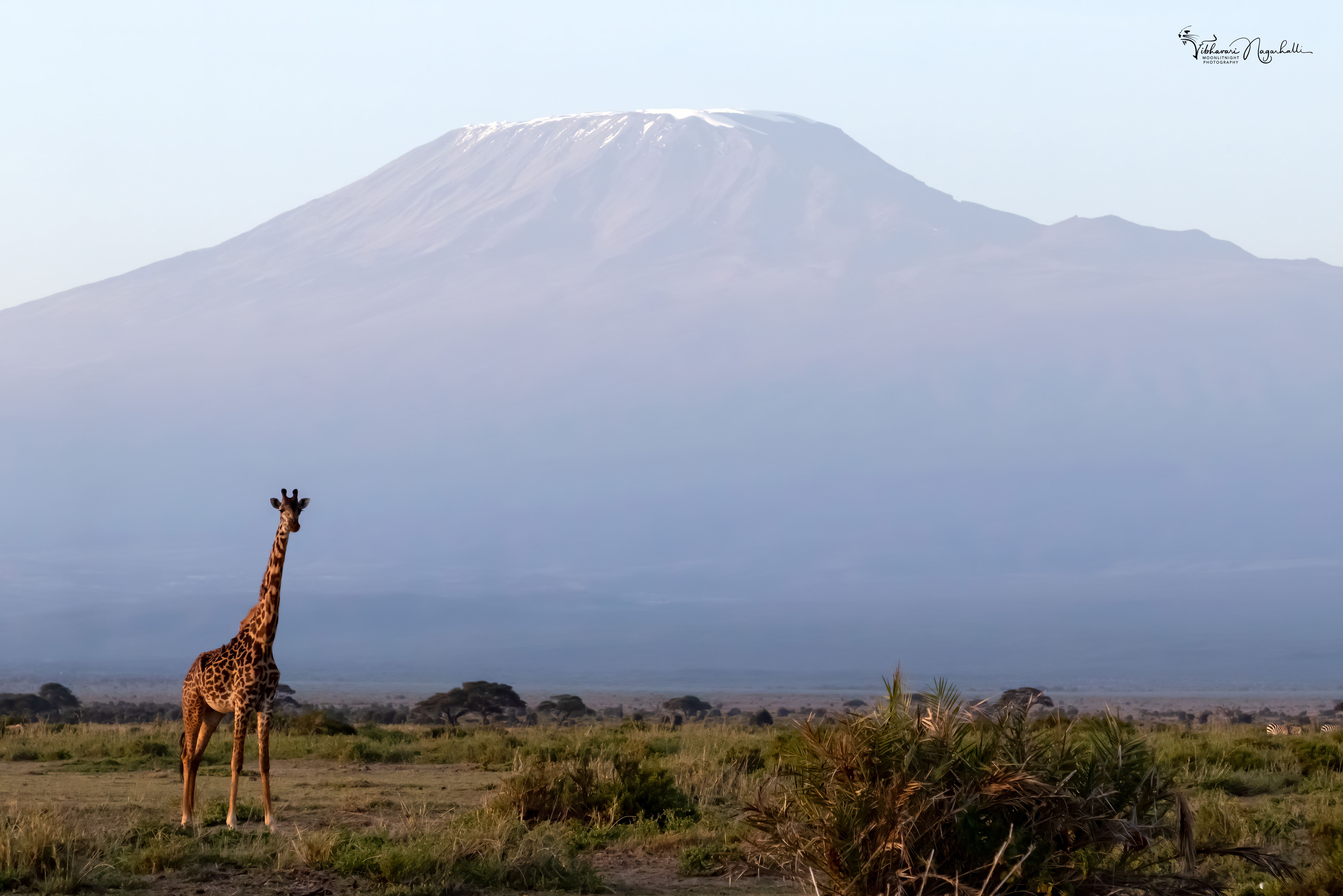 The dream shot is to get an Elephant against the backdrop of the mighty Mt.Kilimanjaro. The snow-clad peak covered with clouds cleared out for us to capture that beautiful scene. The luck was on our side, we got magnificent views and decent pics of elephants against the mountain. Also got a Giraffe with a mountain backdrop. Being about herds of elephants was a feeling I can never forget. It was surreal to watch their graceful walk, flap their huge ears, pluck/feed, and bathe with their trunks and those gorgeous ivory tusks which shone brightly in the morning sun. The famed graceful gait of the elephants is a sight to behold. I saw huge herds of elephants, with at least 70-80 elephants, walking single file across the Amboseli landscape. The formation was such that ensured the young baby elephants were protected by matriarchs on all sides.